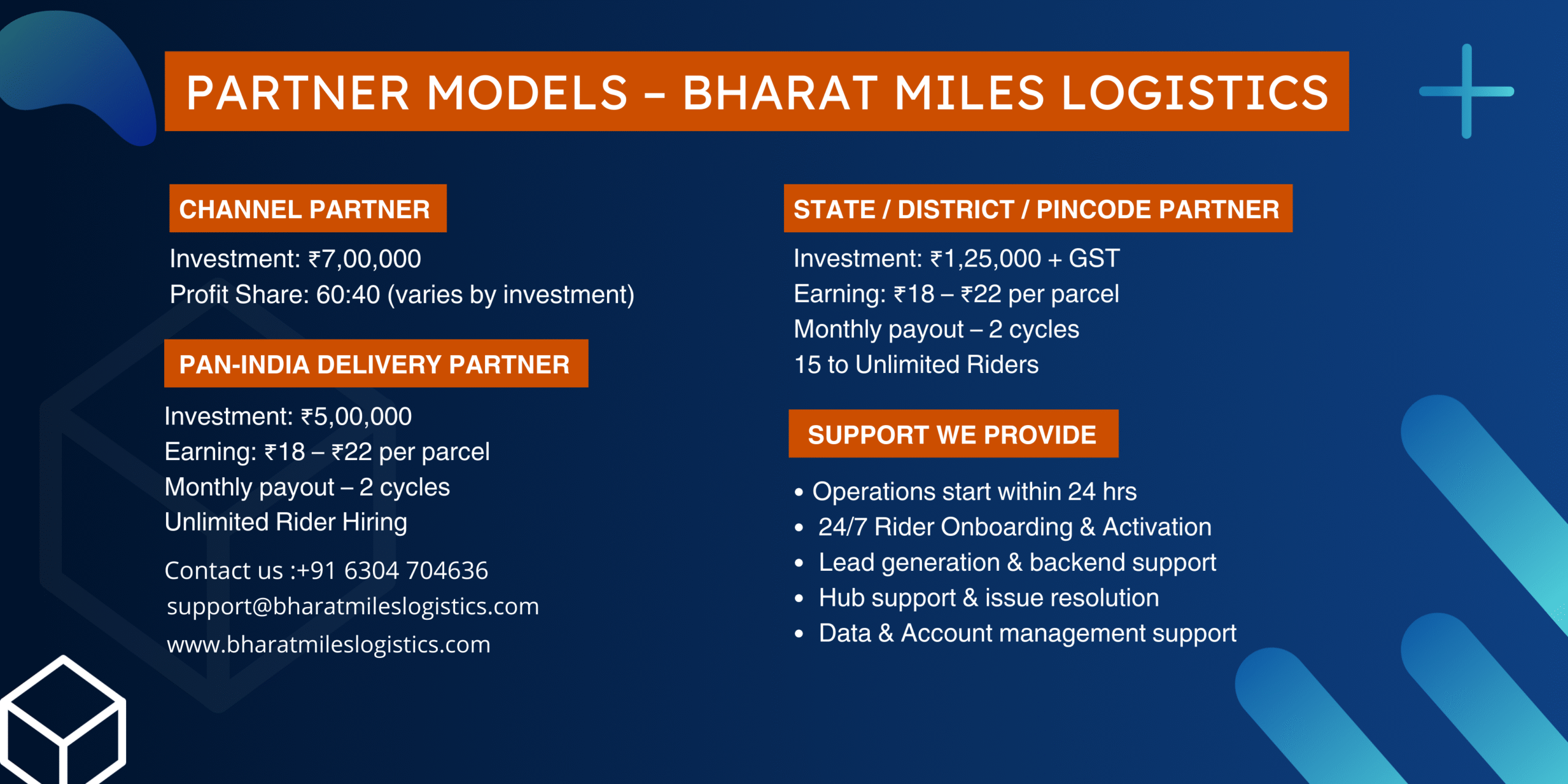 Bharat Miles is a dynamic franchise registration and business enablement company committed to accelerating entrepreneurial success across India. We specialize in simplifying the process of launching franchise ventures by offering expert guidance, streamlined approvals, and end-to-end support. Our trusted partnerships with leading e commerce and logistics giants including Myntra, Flipkart, Meesho, Safe Express, Blue Dart, Aramex, and FedEx ensure that our clients gain immediate access to robust distribution networks and high-growth marketplaces.